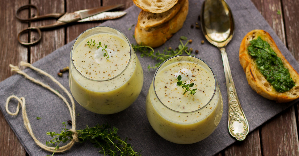 - Сервировка в стекле. Суп в бокале удивит ваших гостей, но сервировка при этом будет оставаться практичной. Лучше всего для такой подачи подходят супы-пюре и супы насыщенного цвета. Стоит учесть, что горячие блюда в стеклянном стакане быстро остынут, поэтому от них следует отказаться. Оптимальным вариантом будут супы, которые принято есть холодными.