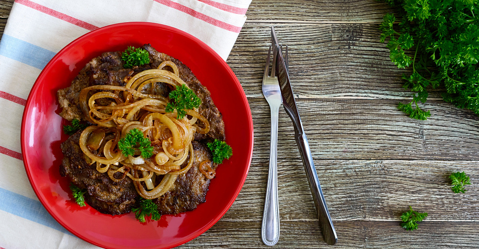 ЖАРКА СТЕЙКА. Хорошо разогрейте сковороду. Обжаривайте по 2-3 минуты с каждой стороны до румяной корочки. В конце добавьте нарезанный кольцами лук, жарьте ещё 2 минуты.