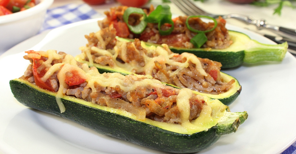 Заполните получившейся начинкой лодочки из цуккини. Твёрдый сыр натрите на крупной тёрке и посыпьте лодочки сверху.