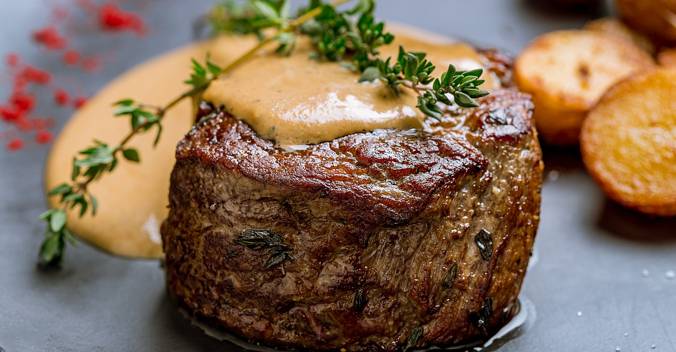 ПОДАЧА. Подавайте с овощами-гриль, печеным картофелем или соусом (демиглас, перечный, беарнез).